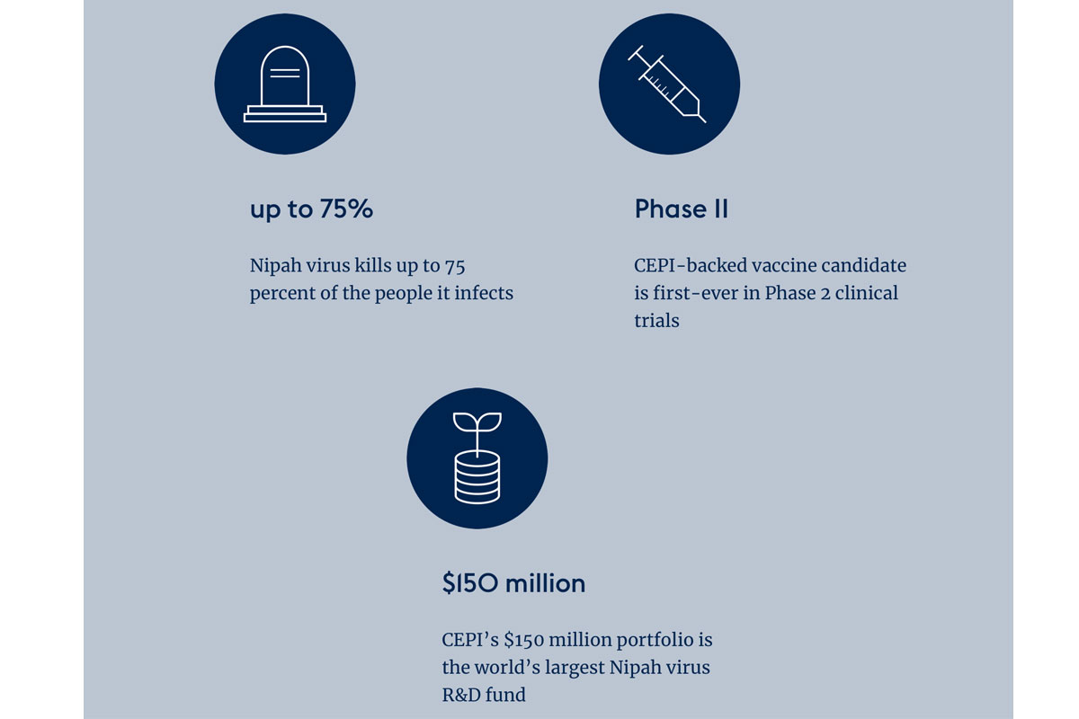 CEPI is the world’s largest funder of Nipah research and development. Its $150 million portfolio—including two Nipah vaccine candidates and a monoclonal antibody—spans the whole preparedness chain, from countermeasure development and manufacture, to preparing for a novel Nipah-like Disease X—an as-yet unknown pathogen with outbreak potential—that could emerge from the same paramyxovirus viral family.