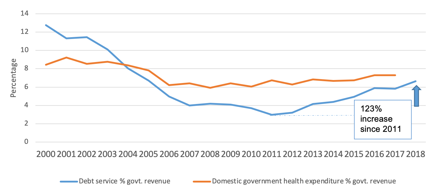 Figure 1: Median cost of debt servicing as a % of government revenue, and domestic government health expenditure as % government revenue, Gavi-73 countries