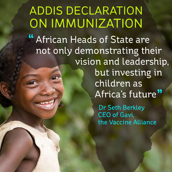 The announcement has also been welcomed by UNICEF. "We would like to congratulate the Heads of State on making this very important commitment. All children, no matter where they live or what their circumstances are have the right to survive and thrive. By endorsing the Addis Declaration on Immunisation, African Leaders have set the stage to ensure that all children on the African continent receive the vaccines they need“ said Dr Robin Nandy, UNICEF Chief of Immunisation.