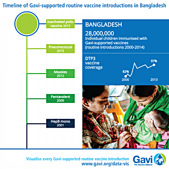 Geneva/Dhaka, 20 March 2015 – Two new life-saving vaccines are being introduced tomorrow into Bangladesh’s national immunisation programme thanks to support from Gavi, UNICEF, WHO and the Global Polio Eradication Initiative (GPEI) partners.