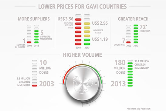 A supply agreement with Biological E Ltd of India makes the five-in-one shot available to GAVI for just $1.19 per dose, compared to the 2012 weighted average price of $2.17.
