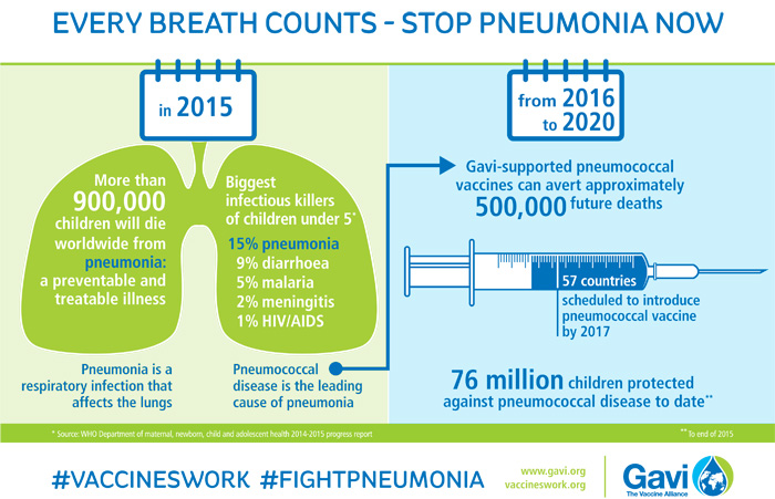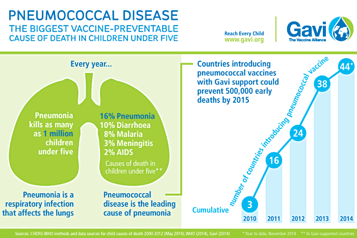 Pneumonia kills nearly 1 million children under five and pneumococcal disease is the leading cause of pneumonia. Countries introducing pneumococcal vaccines with Gavi support could prevent 500,000 early deaths by 2020.
