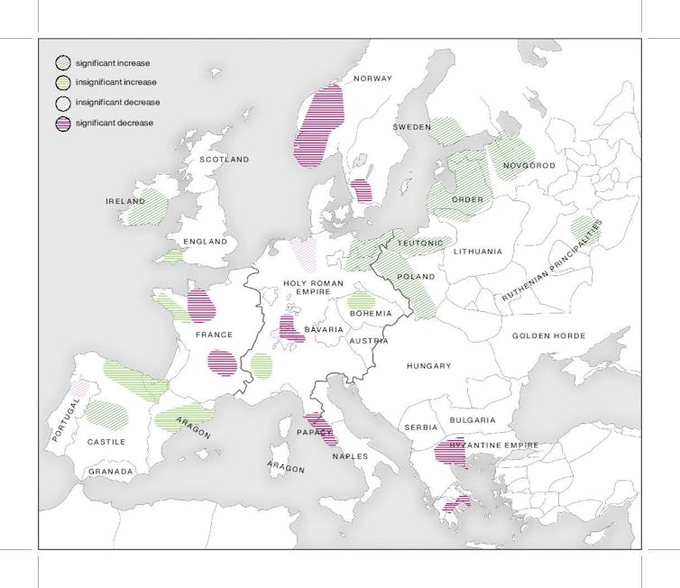 We discovered that there were indeed parts of Europe where the human landscape contracted dramatically after the Black Death arrived. This was the case, for instance, in southern Sweden, central Italy and Greece. In other regions, like Catalonia or Czechia, however, there was no discernible decrease in human pressure on the landscape. In others yet, such as Poland, the Baltic countries and central Spain, labour-intensive cultivation even increased, as colonisation and agricultural expansion continued uninterrupted throughout the late Middle Ages. This means the Black Death’s mortality was neither universal nor universally catastrophic. Had it been, sediment records of Europe’s landscape would say so.