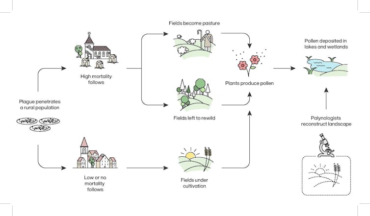 For more than a century, paleoecologists – people who study past ecosystems – have been amassing data. In several world regions, the quantity of evidence available is overwhelming and certainly enough to ask questions about big historical events, like the Black Death. Did its mortality affect land use? Were arable fields turned into pasture or deserted and left to rewild?
