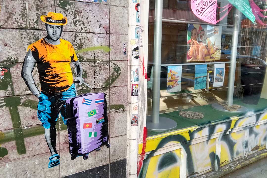 Not long after Lapiz’s visit to the osteopath, a new mural appeared on the street-facing wall of a travel agent in Hamburg’s Sankt Pauli district. The piece, which stands about 1 metre 30 centimetres high, depicts a tourist, post-jab band-aid marking his upper arm, awkwardly contrapposto alongside his purple roll-along suitcase, paunchy in a loud yellow t-shirt and yellow hat. The man’s hat-band is stamped “Reisefieber”, a word which literally translates to “travel-fever,” and means something similar to another German import, “wanderlust”, but more fervid, more pathological.