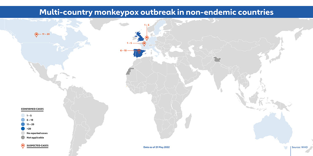 What started as one unusual case of monkeypox has now spread to several countries, with many cases having no link to Central or Western Africa where the disease is endemic. The World Health Organization’s (WHO) most recent estimates from 21 May (see map) indicate that there are around 100 cases in 12 non-endemic countries, though there could be around 300 confirmed or suspected cases in 16 non-endemic countries.