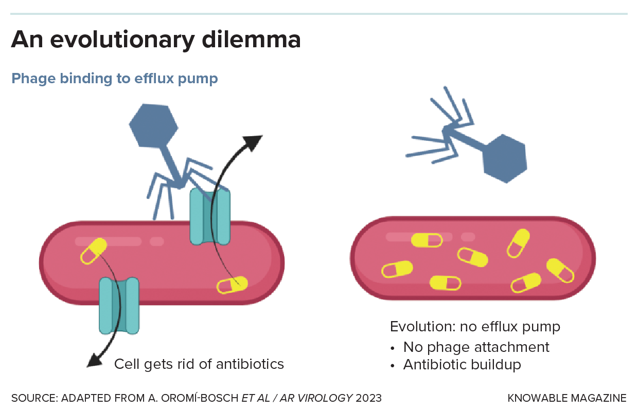 As it turns out, some phages appear to use these same efflux pumps to invade the bacterial cell. The phage presumably attaches its tail to the outer portion of the pump protein, like a key slipping into a lock, and then injects its genetic material into the cell. This lucky coincidence led Paul Turner, an evolutionary biologist at Yale University, to suggest that treating a patient with phages and antibiotics simultaneously could trap bacteria in a no-win situation: If they evolve to modify their efflux pumps so the phage can’t bind, the pumps will no longer expel antibiotics, and the bacteria will lose their resistance. But if they retain their antibiotic resistance, the phages will kill them, as Turner and colleagues explained in the 2023 Annual Review of Virology.