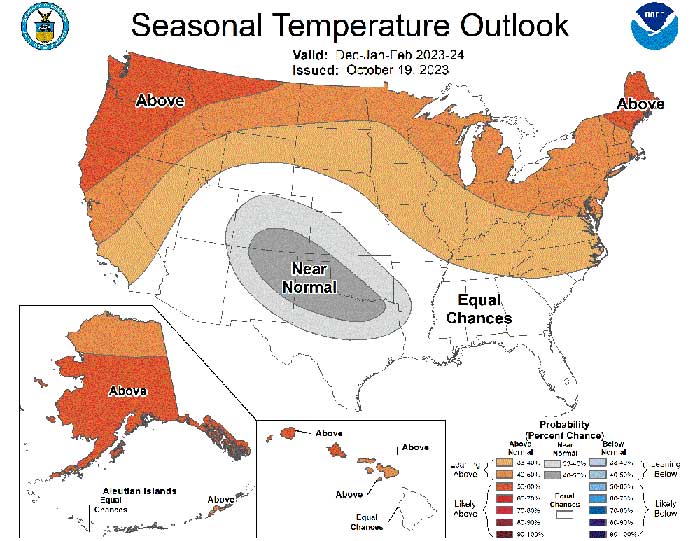 For the US, NOAA predicts warmer-than-average temperatures are likely across wide stretches of the country, reaching into the Pacific west and along the northern half of the Atlantic coast.