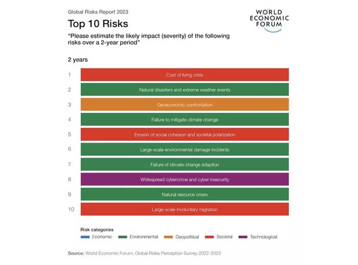 According to the World Economic Forum's Global Risks Report 2023, climate-related risks are the top concerns for risk experts as they look ahead. Factors ranked for severity include extreme weather events, biodiversity loss and ecosystem collapse, and large-scale environmental damage. But the greatest risks emanate from failing to mitigate and adapt to climate change, which tops the list as the most pressing issue of the next decade.